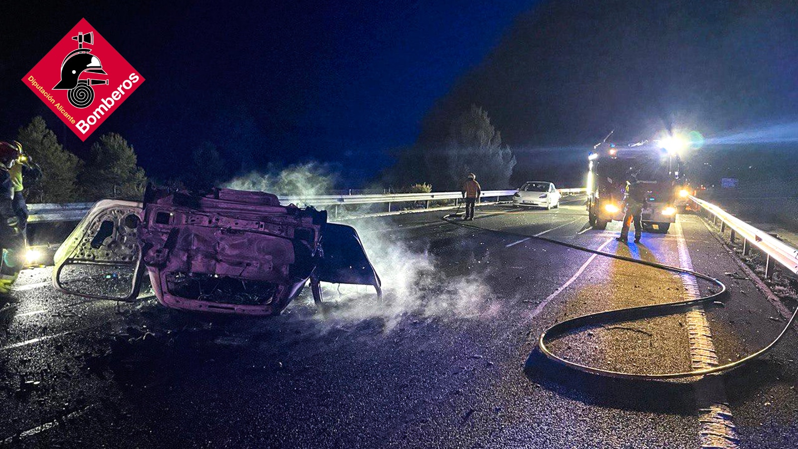 La carretera de Biar, en direcció a Alcoi, va ser ahir escenari d’un accident entre dos vehicles. El primer, de combustió, va col·lidir contra un altre mogut per energia elèctrica. El primer vehicle va bolcar i es va produir un incendi. El seu conductor, que va aconseguir eixir amb ajuda d’altres conductors, va resultar ferit. Quan va arribar el SAMU, va ser atès per politraumatismes.