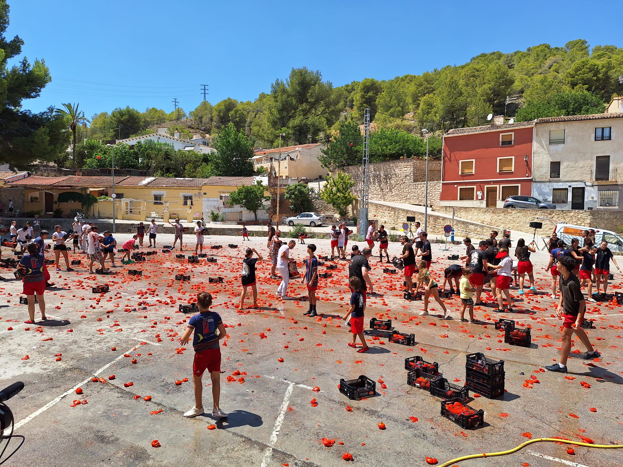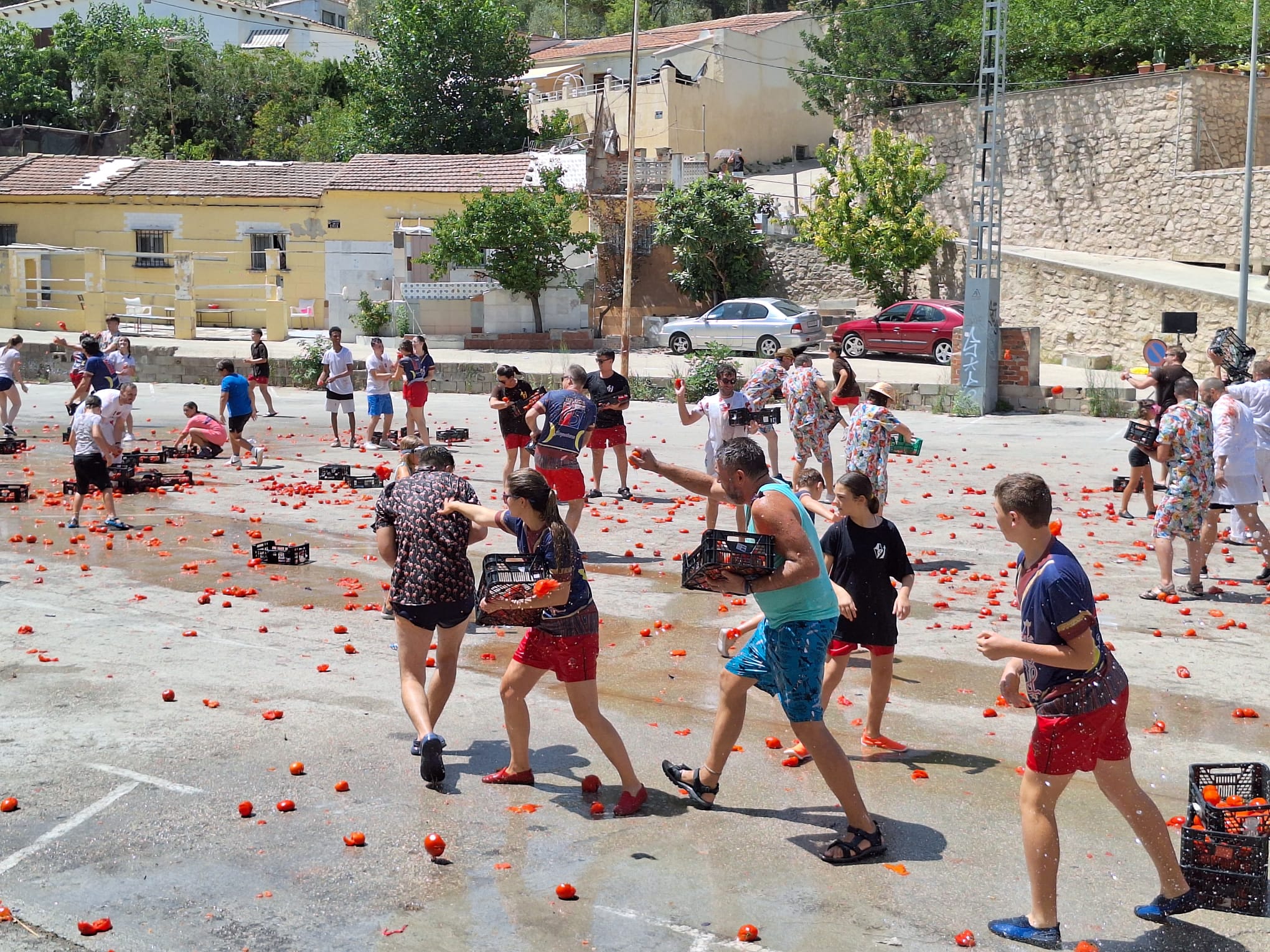 Membres de la filà Bequeteros i Cavallets han iniciat un combat on les tomaques volaven d’un costat a altre, acabant tot el món roig de cap a peus. Una festa on l’humor i les rialles estan a l’ordre del dia i que s’ha desenvolupat sense cap incident a destacar. Si vols veure la “batalla”, t’esperem al vídeo que acompanya aquesta notícia.
