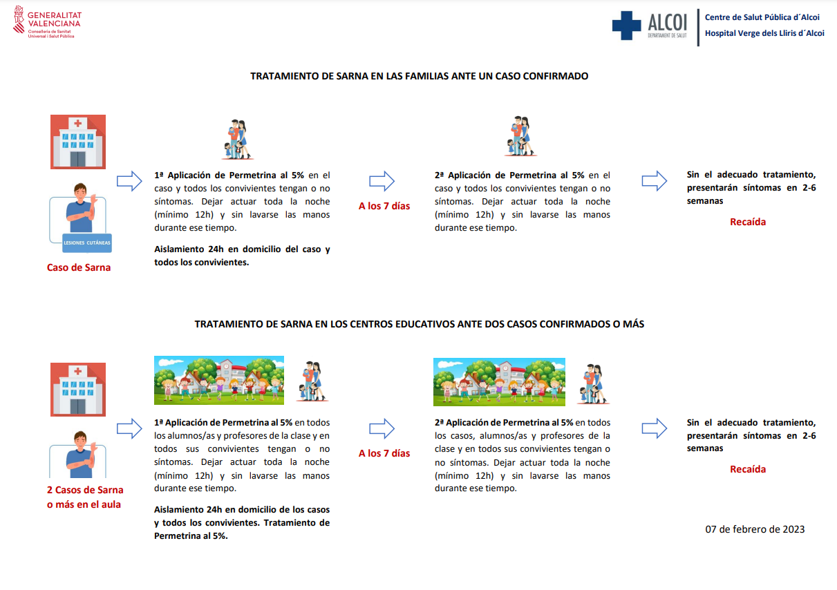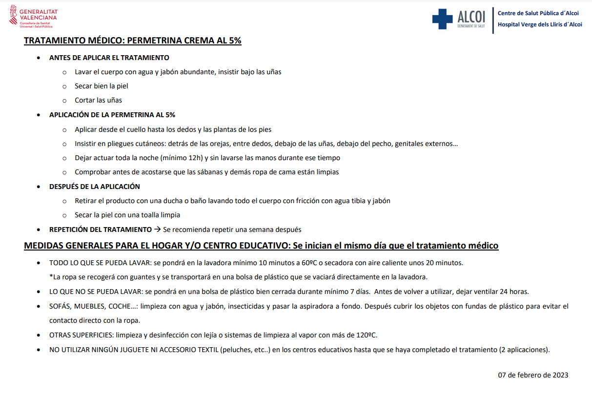 Des de Conselleria de Sanitat, han informat a més, que des de Salut Pública, i en coordinació amb el Departament de Salut d’Alcoi van a enviar un dermatòleg als centres escolars per explorar a tots els xiquets i xiquetes amb l’autorització prèvia dels pares i mares. També s’ha preparat el següent full informatiu amb les recomanacions sanitàries i higièniques: