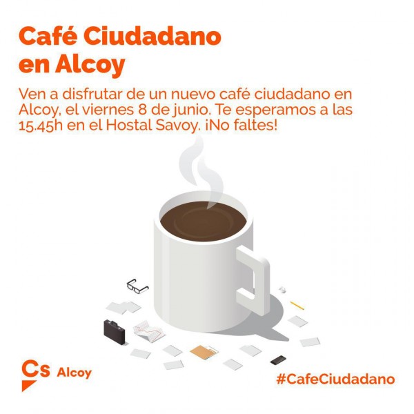 Ciutadans Alcoi proposa un 'café ciutadà', una trobada informal amb dos regidors de la formació taronja al consistori alcoià per a conéixer el partit i els seus objectius, al mateix temps que des de Ciutadans poden arreplegar propostes i suggeriments dels veïns. La trobada començarà amb la ponència 'Cs Alcoi, què som?', per part de Jordi Sedano i Maribel Sánchez, tots dos regidors al consistori alcoià, i on explicaran "què proposem per a Alcoi, quines són les nostres intencions i quina idea de ciutat tenim". També participarà el coordinador de Ciutadans Alcoi, Marcos Martínez, qui explicarà "com estem organitzats en Alcoi, quines estructures tenim i, per descomptat, com es poden aportar idees i iniciatives".