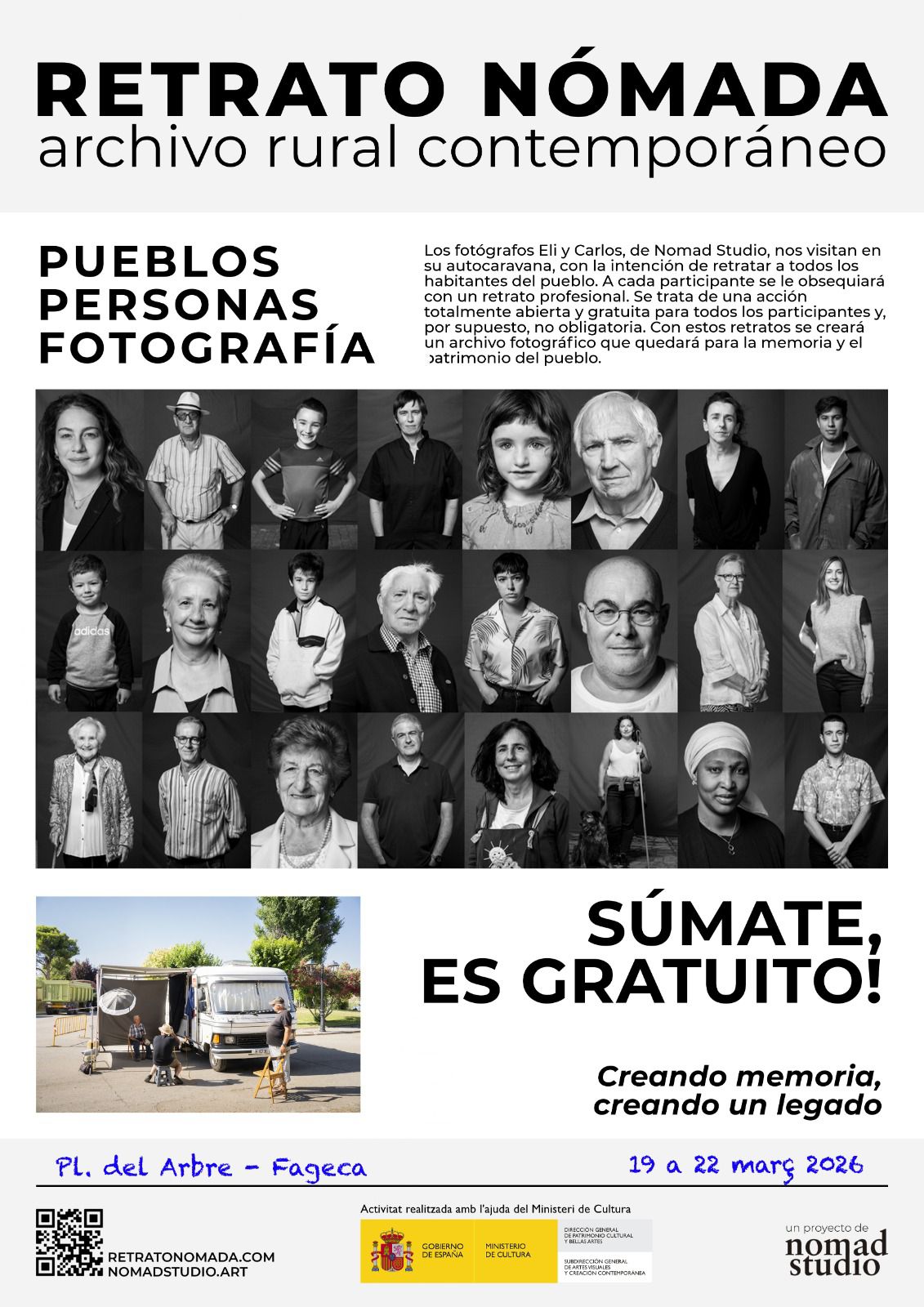 Fageca acollirà del 19 al 22 de març el projecte Retrato Nómada, una iniciativa cultural que recorre diverses localitats d’Espanya amb l’objectiu de retratar els habitants dels pobles i crear un arxiu visual de la vida rural actual. D'aquesta manera, i durant quatre dies, la plaça de Fageca es convertirà en un vertader estudi fotogràfic fins on es podran acostar tots els veïns.