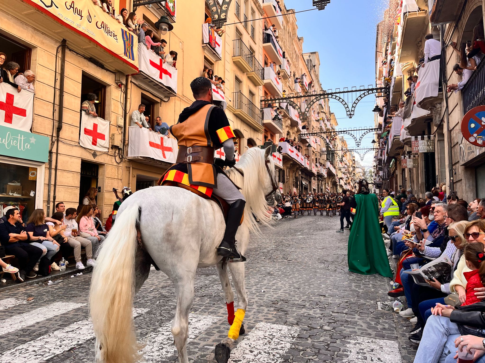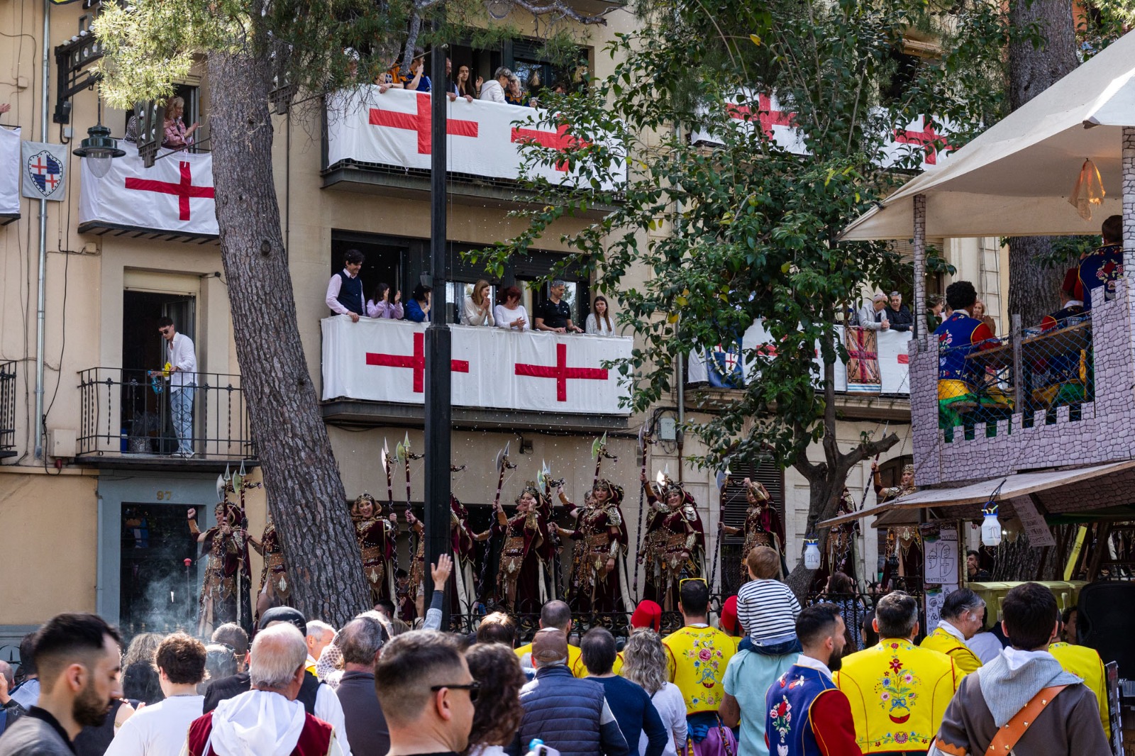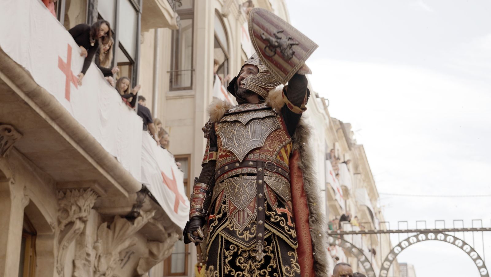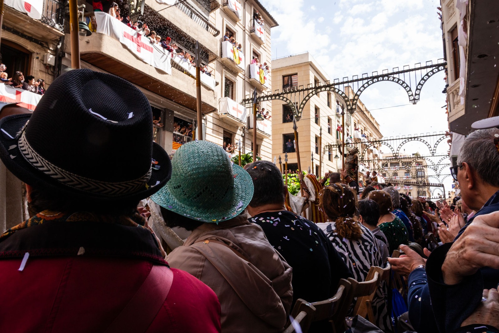 La Plaça d'Espanya s'ha omplit de roig i groc en referència a l'escut de la Filà Aragonesos quan el capità cristià ha rebut les claus del Castell. Darrere d'ell, la resta de filaes cristianes acompanyades de les seues bandes de música.