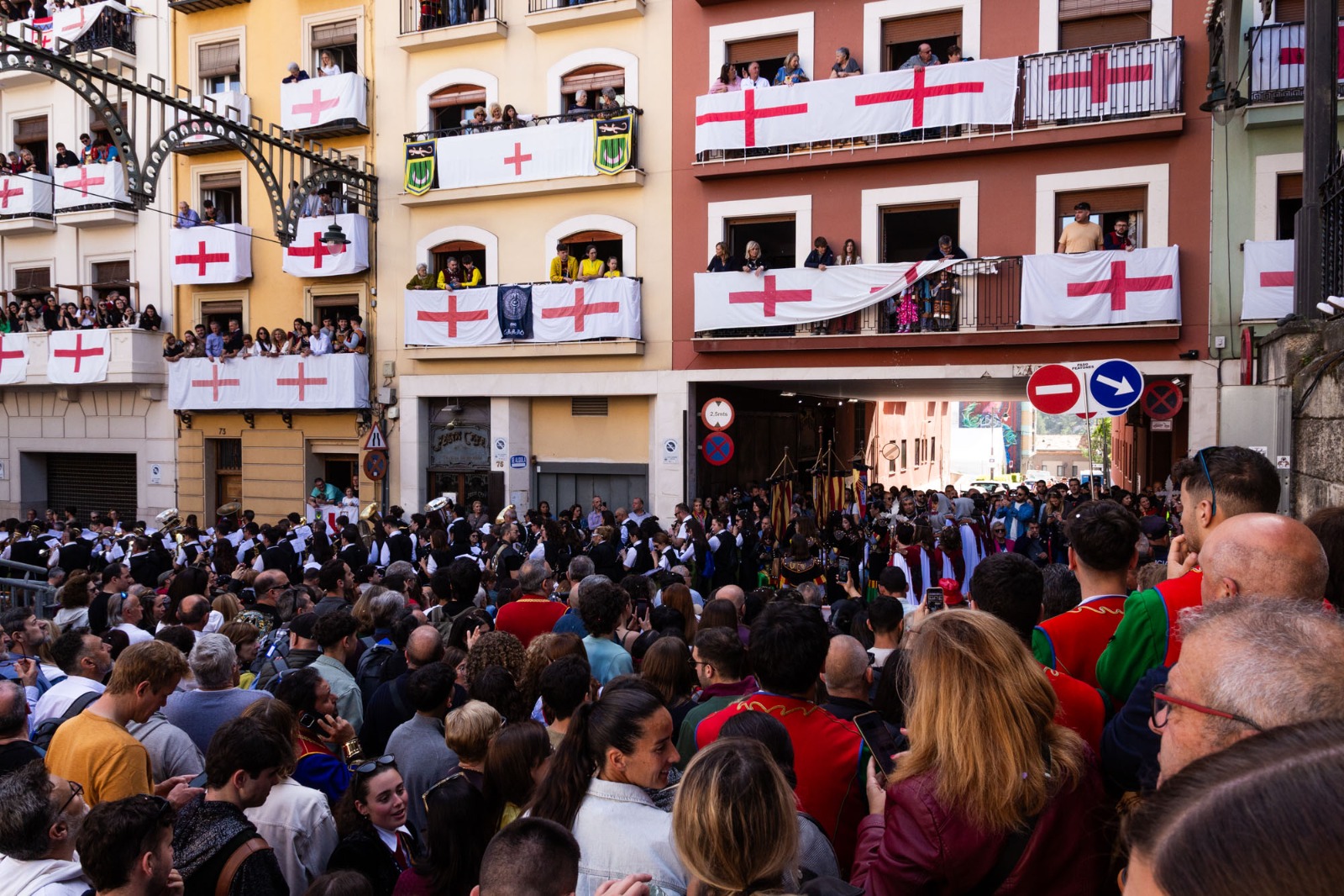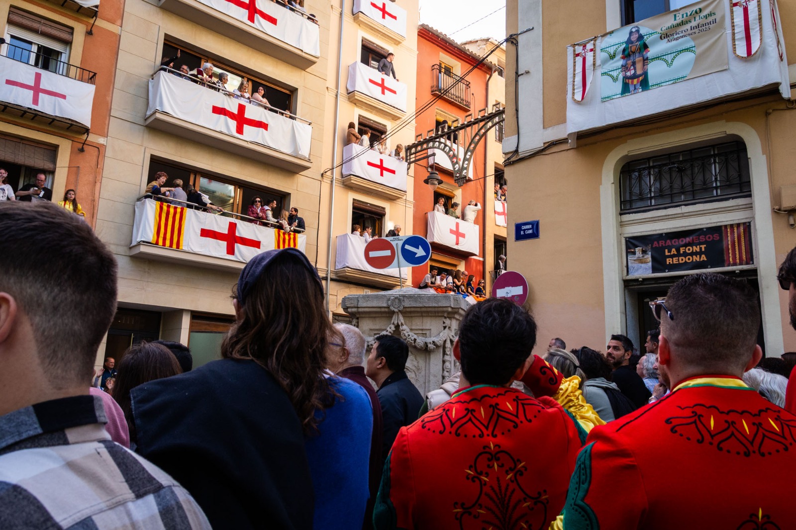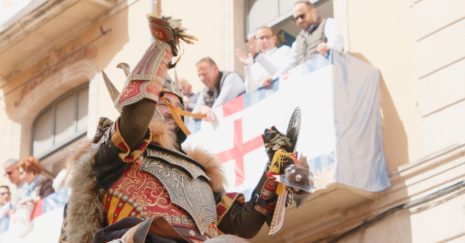 La Plaça d'Espanya s'ha omplit de roig i groc en referència a l'escut de la Filà Aragonesos quan el capità cristià ha rebut les claus del Castell. Darrere d'ell, la resta de filaes cristianes acompanyades de les seues bandes de música.