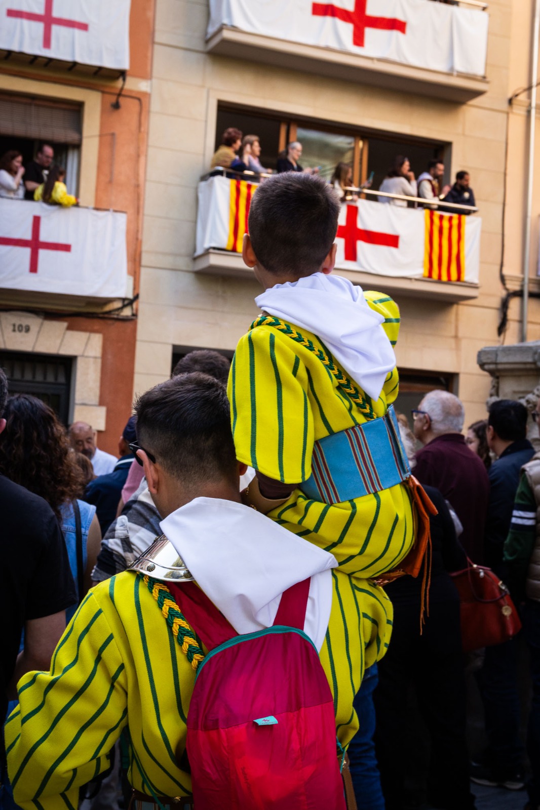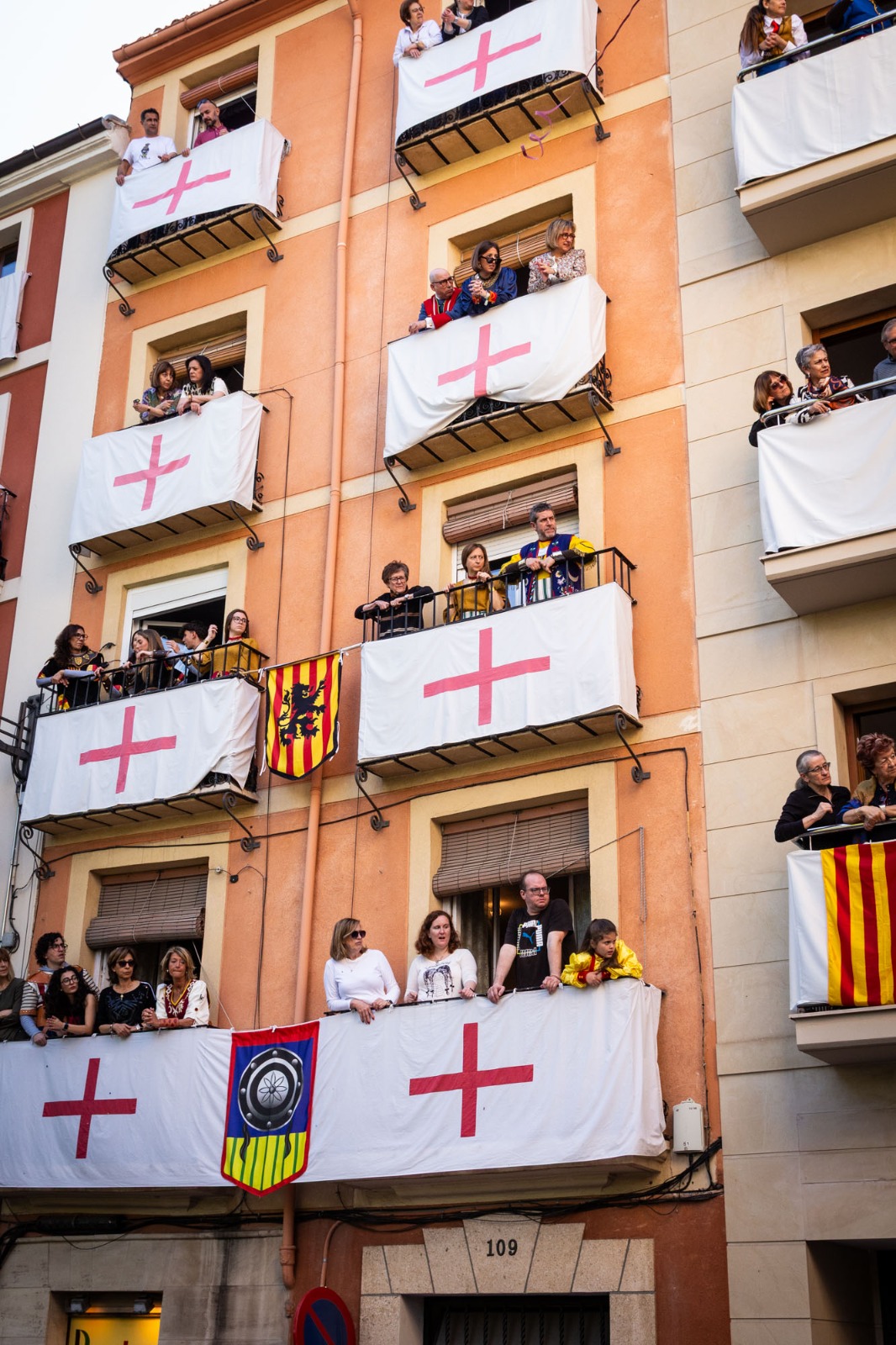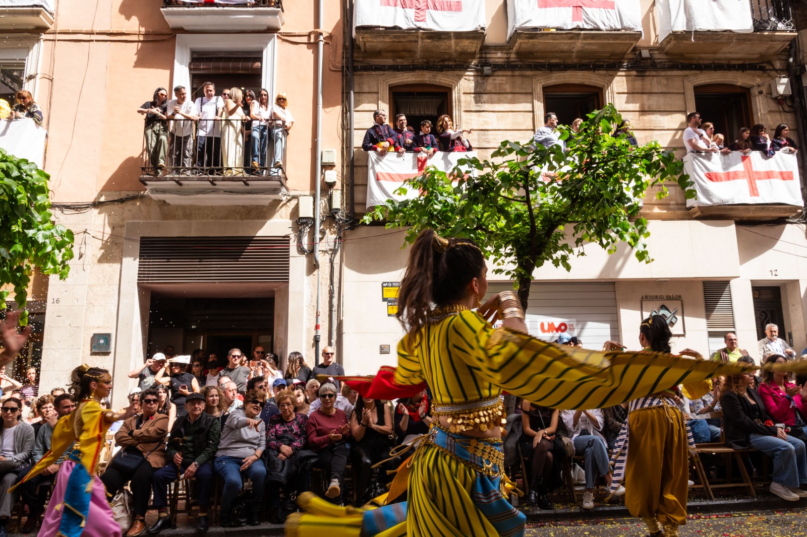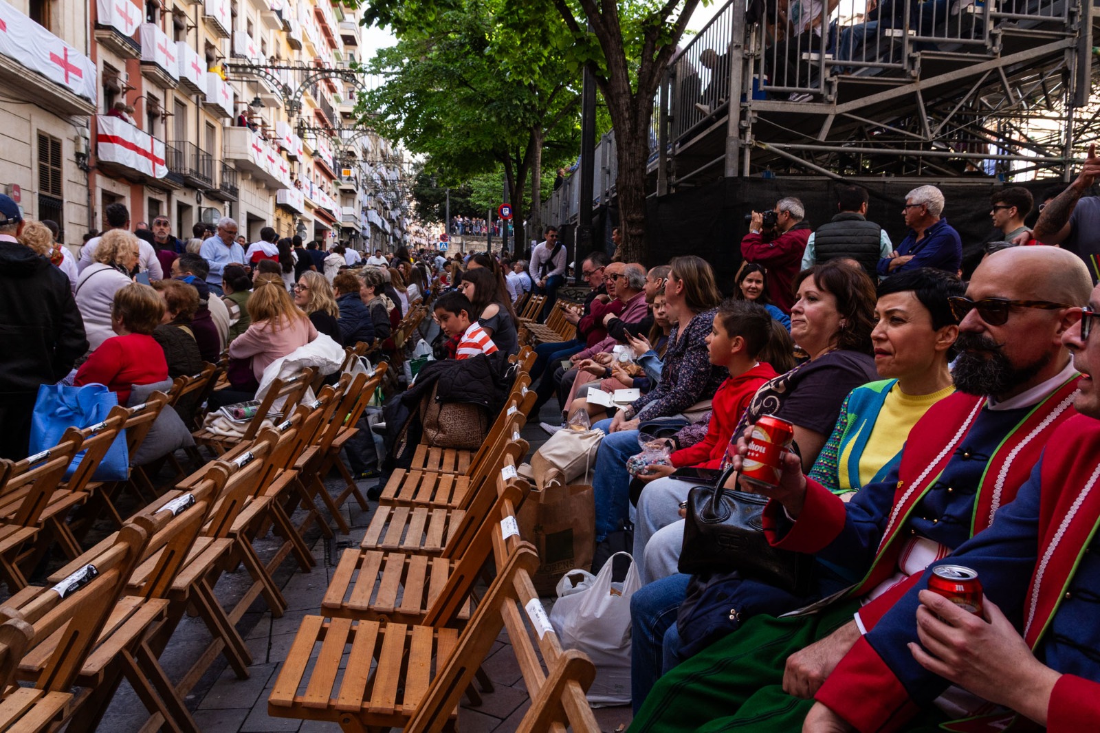 La Plaça d'Espanya s'ha omplit de roig i groc en referència a l'escut de la Filà Aragonesos quan el capità cristià ha rebut les claus del Castell. Darrere d'ell, la resta de filaes cristianes acompanyades de les seues bandes de música.