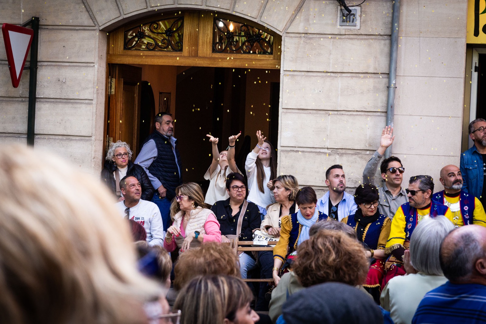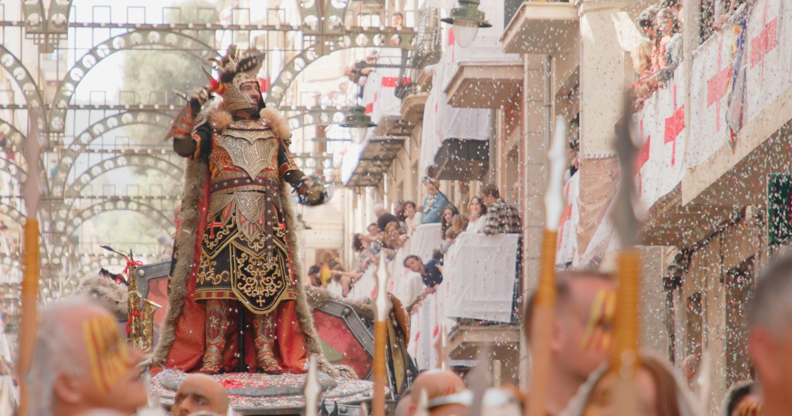 Confeti i serpentines grogues i roges han caigut sobre el capità cristià, Salvador González, de la Filà Aragonesos en el moment de l’entrega de claus del Castell a la seua arribada a la Plaça d’Espanya. Un moment d’eufòria i goig que ha estat acompanyat de molta música i balls.