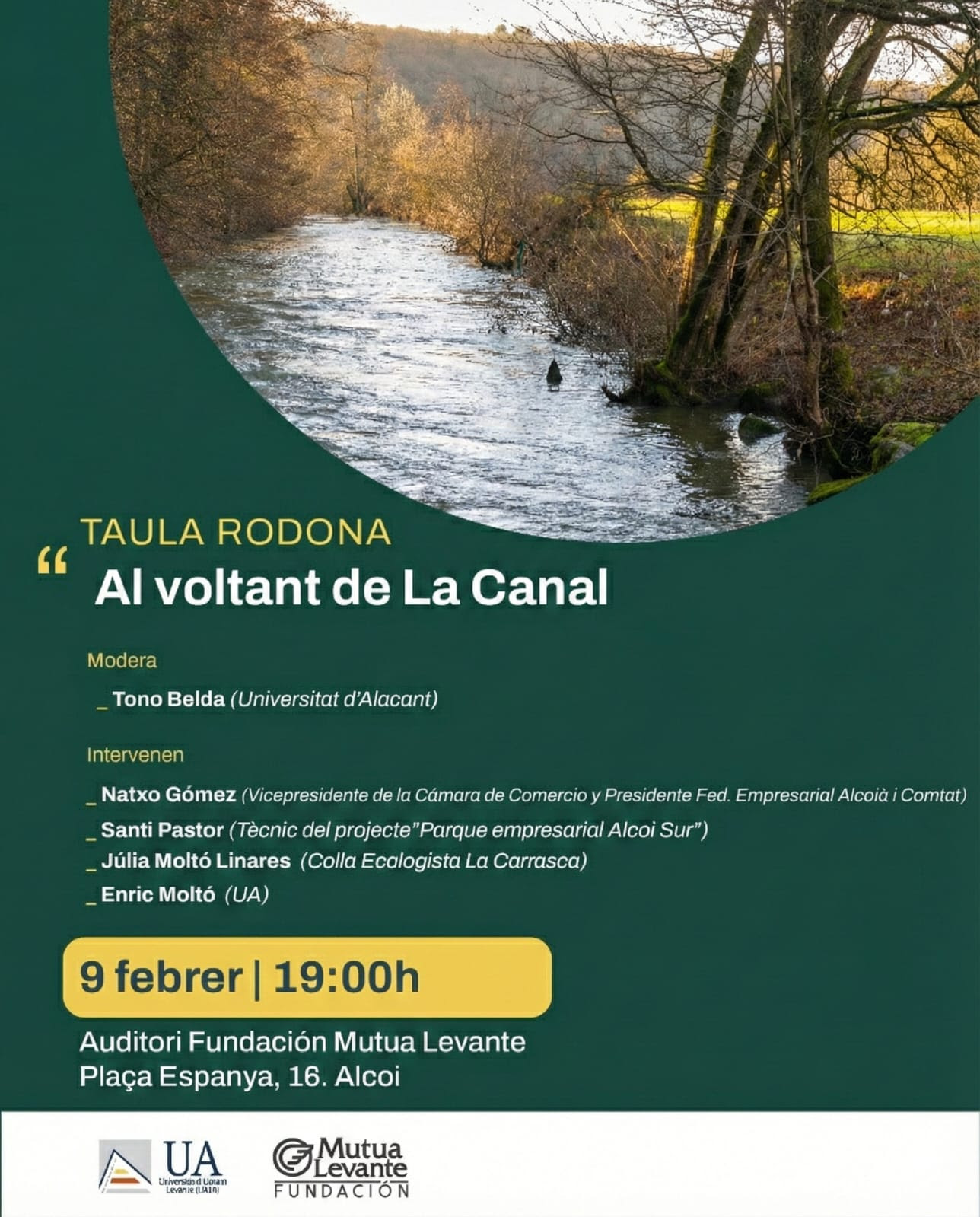 La taula estarà moderada per Tono Belda, de la Universitat d’Alacant, UA, i en ella intervenen: Natxo Gómez, vicepresident de la Cambra de Comerç, Santi Pastor, tècnic del projecte ‘Parque Empresarial Alcoi Sur’, Júlia Moltó, de la Colla Ecologista La Carrasca i Enric Moltó, professor de la UA.