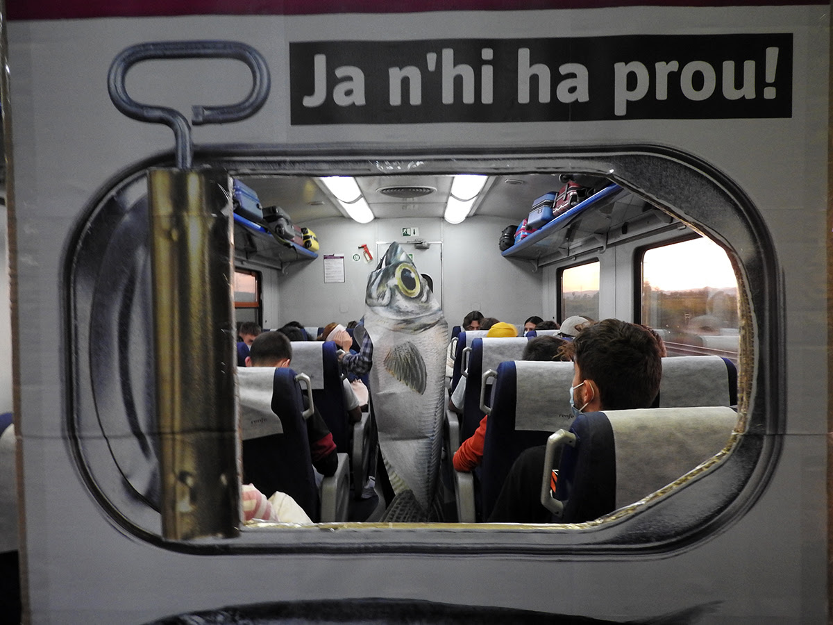 Membres de la Plataforma Salvem el Tren de l’Alcoià-el Comtat s’han disfressat de sardines per mostrar, d’una forma molt il·lustrativa, que els trens estan de gom a gom sobretot els divendres i diumenges, que és quan es produeix un major desplaçament d'estudiants.