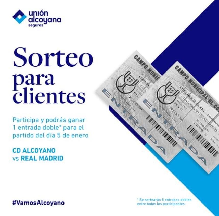 Unión Alcoyana Seguros sorteja entre tots els seus clients 5 entrades dobles per al partit que disputaran Alcoyano i Real Madrid el pròxim 5 de gener a Alcoi. Tan sols cal seguir el perfil d'Unión Alcoyana Seguros a Facebook o Instagram, i deixar un comentari en les entrades sobre el sorteig on digues en qui t'agradaria anar al partit. Si comparteixes la publicació en les teues xarxes, la participació és doble.