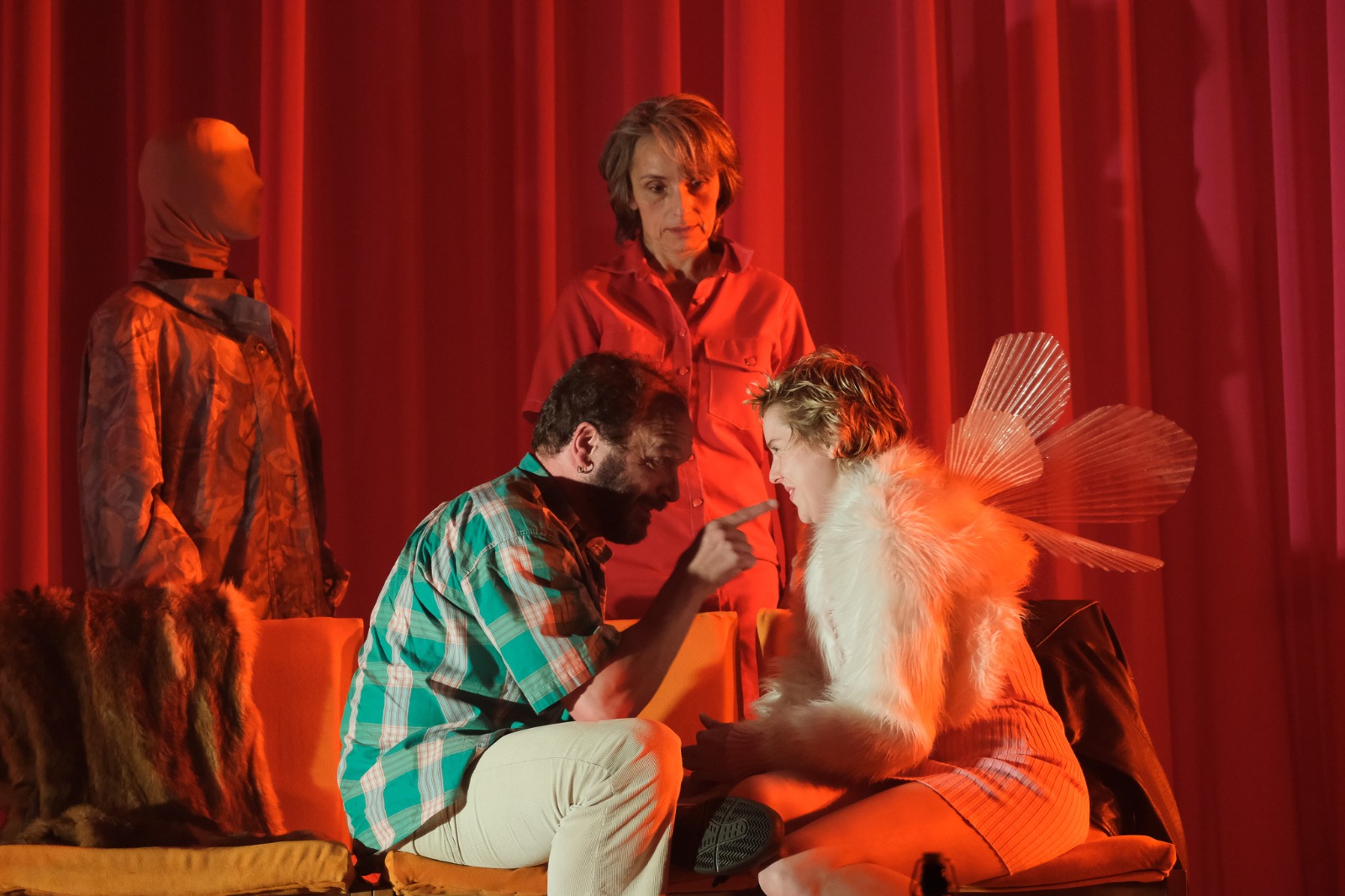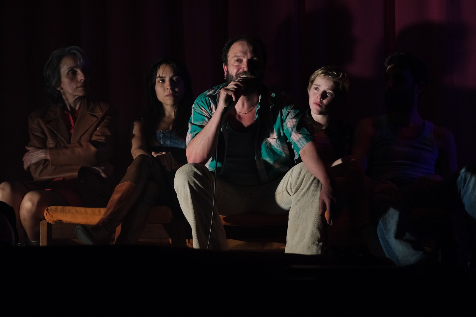 Alce el cap i veig que el teló està obert. Unes cortines roges, de dalt avall, cobreixen (quasi) la totalitat de l’escenari. És l’Habitació Roja, de Twin Peaks, un lloc situat en una dimensió paral·lela del qual no resulta gaire fàcil eixir. A l’escenari hi ha 5 actors i actrius, caminant d’un costat a un altre. Fent moviments estranys. Alguns em recorden un VHS de Jane Fonda. No tinc temps per a analitzar aquesta dansa/ritual/escalfament/aeròbic(?), de seguida comença la representació. Hui va puntual. Es nota que no és una companyia valenciana.