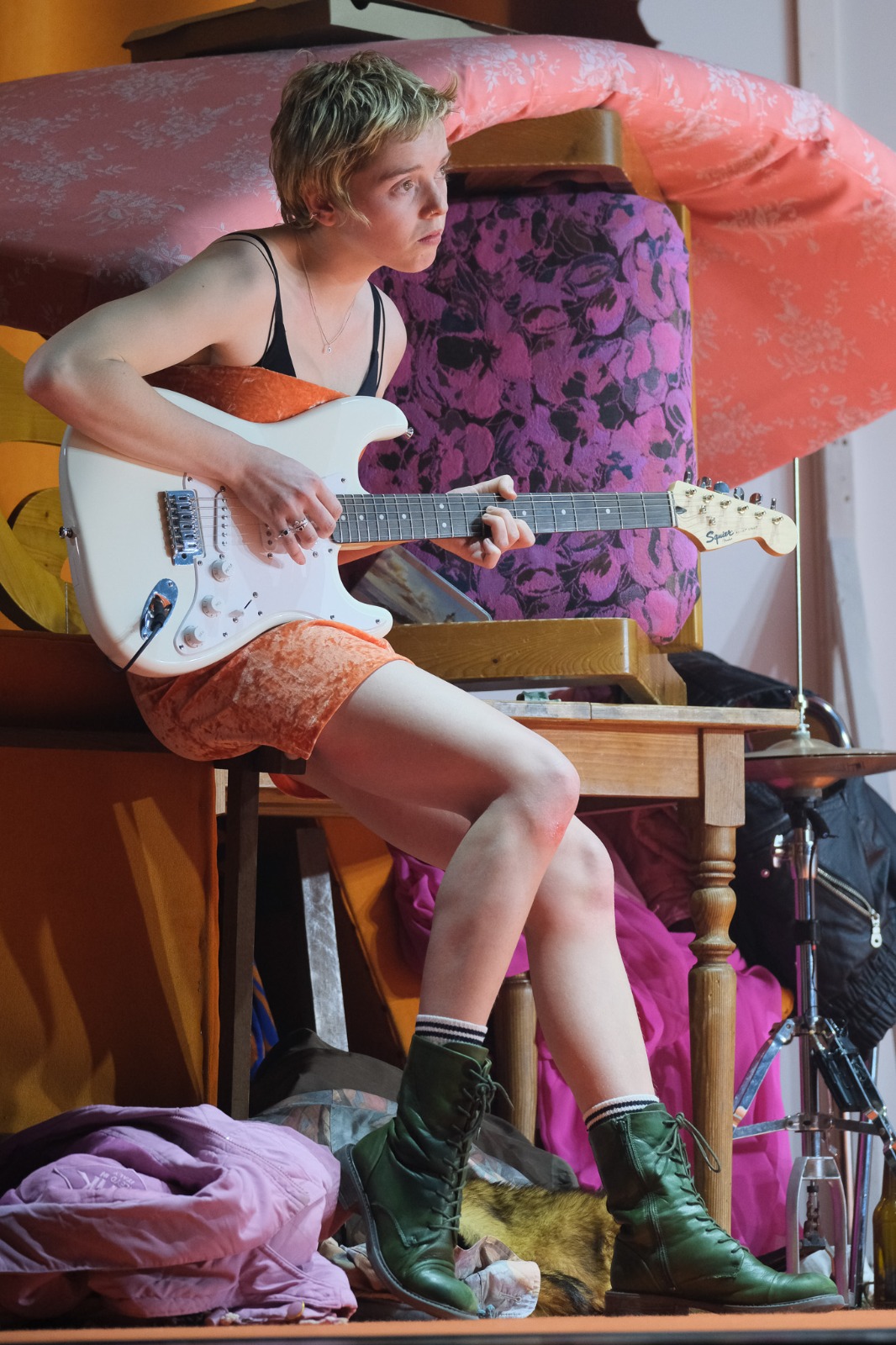 Accedisc al pati de butaques i sec. Un cardat gegant em tapa part de l’escenari. Em trasllade al seient del costat. Hui el teatre està més buit del que és habitual i hi ha més seients disponibles.