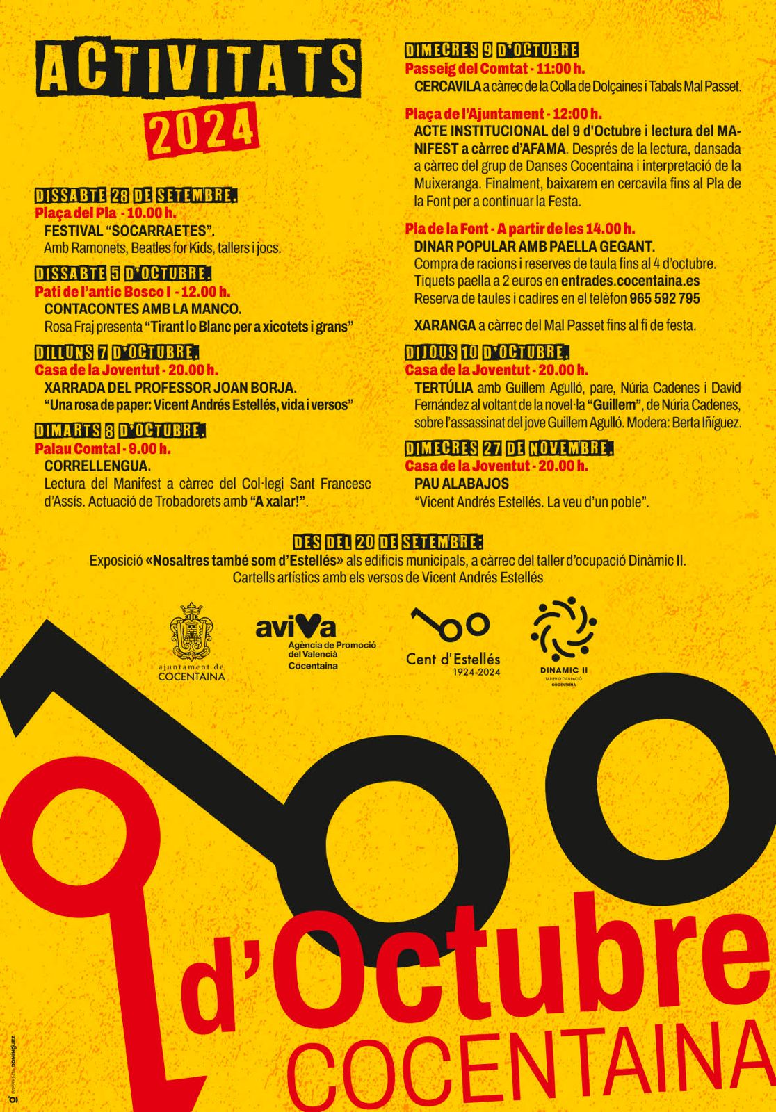 Com fan molts municipis de les nostres comarques, Cocentaina celebra actes al voltant de la Festa dels Valencians. El dia central, el 9 d’octubre, hi haurà cercavila, lectura de manifest reivindicatiu i paella gegant. Estellés serà protagonista en molts dels actes.