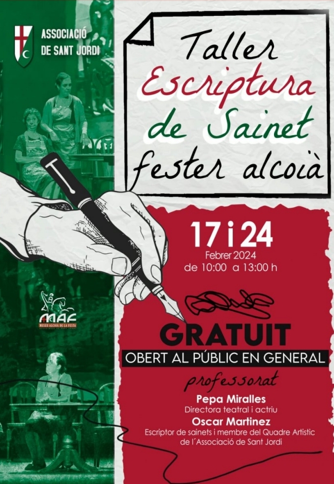 L'Associació de Sant Jordi vol promoure i motivar l'escriptora de sainets festers alcoians, i per això presenta un taller d'escriptura totalment gratuït per a tots els interessats. El taller tindrà lloc els pròxims dissabtes 17 i 24 de febrer al Casal de Sant Jordi, i està dirigit i impartit per dos persones molt reconegudes en el món teatral: Pepa Miralles i Óscar Martínez.